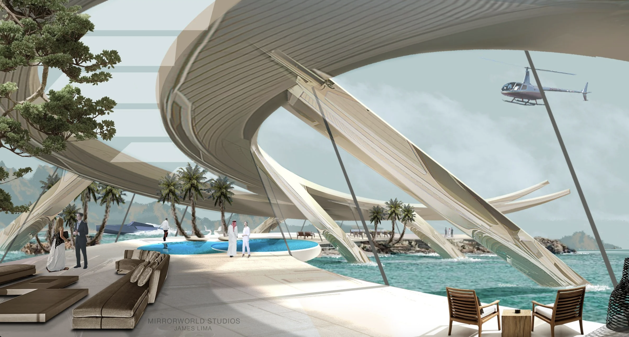 The structure follows the shape of the rocks jutting out to sea and evokes the rhythm of the undulating waves.The natural world with its dramatic contrasts between land and sea, its vivid colors and textures and vast open spaces. These things should be preserved. The Wellness Resort seems to flow like a fountain from the islands core. Just off shore is a a ring-shaped underwater boutique hotel with a semi submerged roof that acts like a shallow pool / deck for sun bathing, yoga or even a disco at night! Pleasure boats can dock at the Hotel’s marina in the center. Spa, meditation, restaurants and juice bars are on land. The boutique hotel is underwater. Access to the hotel is either by boat or a glass tunnel from the spa on the Island. On a near by island a large gold sundial / wind chime creates soothing meditative alpha sounds. In the distance NEOM’s LINE can be seen.